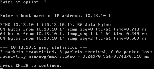 You can now test the configuration by selecting option 7 and using ping to reach your gateway and something on the internet, in this particular case a DNS server from Google: