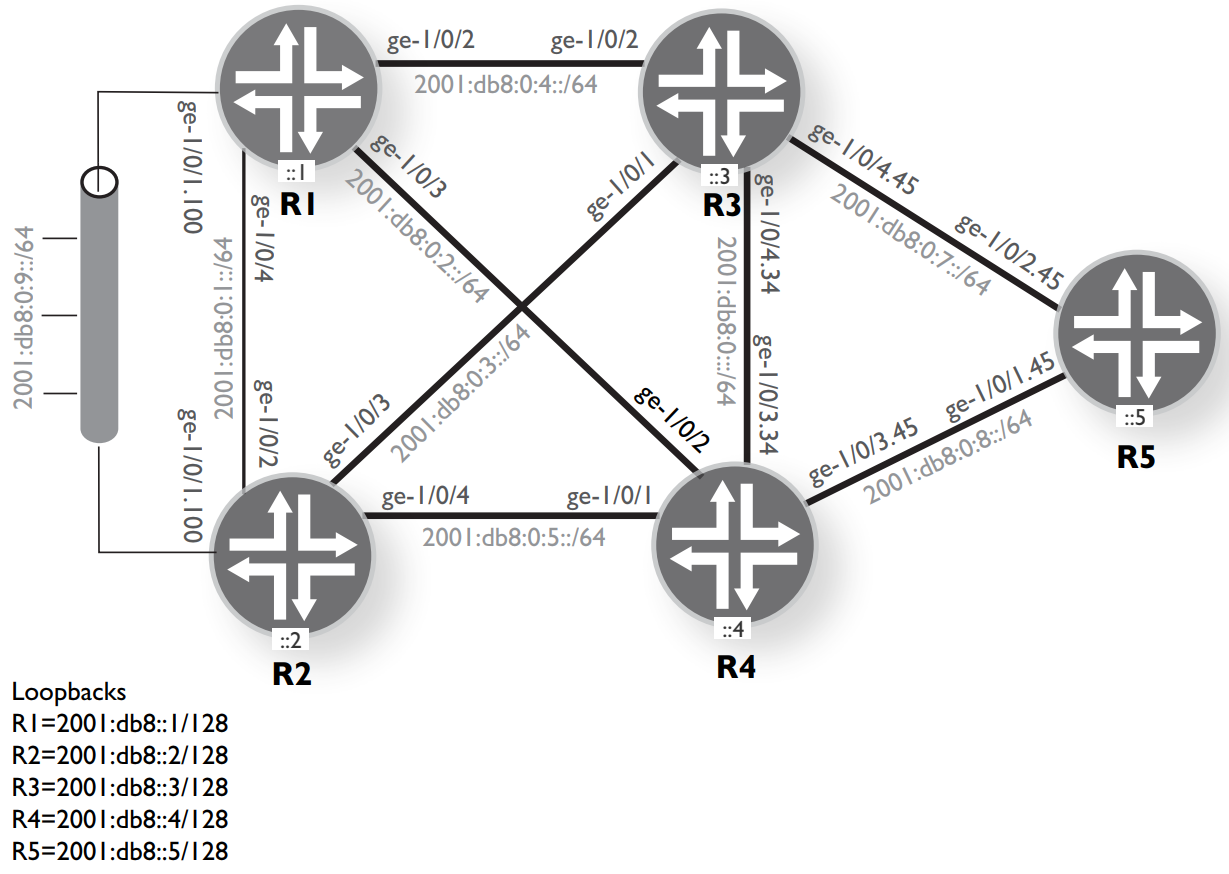 Chapter two is about about setting up the fundamentals of the lab. There is interface configuration, verifying all the links, viewing NDP information, and static routes to make everything reachable. My own lab was built using Wistar and vMX nodes. Still being inexperienced on the Juniper platform I did have a little trouble reading into one piece of the topology correctly. I mixed up the configuration for the links that hold subinterfaces. At first, I configured the addresses on local IRB instances with a corresponding bridge domain. I then placed the interfaces that were supposed to be subinterfaces in the bridge domains I created. Later, while configuring routing protocols, I realized the error I made and migrated everything to proper subinterfaces, which are way easier to configure on a vMX than the bridge domains by the way.