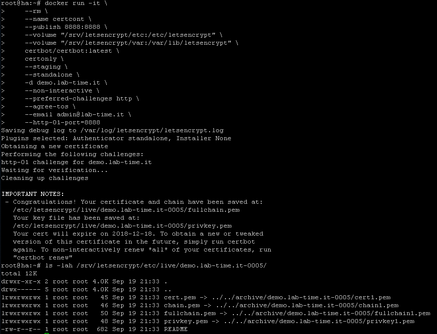 With the required HAProxy configuration in place, we can now run the Certbot container and hopefully receive a valid certificate for our domain. Here’s the command you can use to run the Certbot container:
